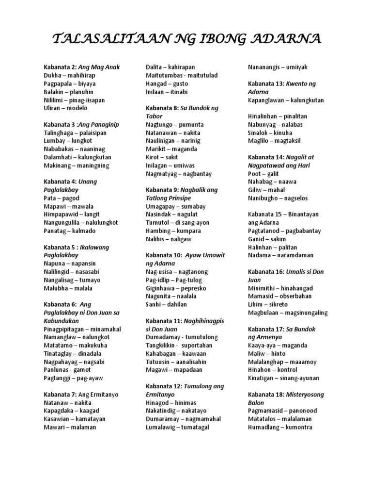 Ang Karamdaman ng Hari Saknong 30 45. Ang mga ito ay halimbawa ng talasalitaan sa Ibong Adarna mula sa Araling 1- 6. See answer 1 Best Answer.