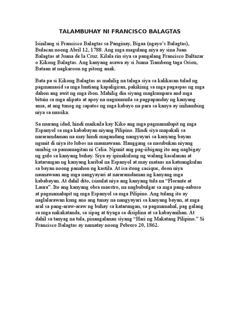 Narito ang isang maikling talambuhay ni Francisco Balagtas sa tagalog. Buod ng Florante at Laura ni Francisco Baltazar January 26 2015 roedzern Nagsimula ang kuwentong patula sa isang madilim na kagubatan. May tatlo siyang kapatid.