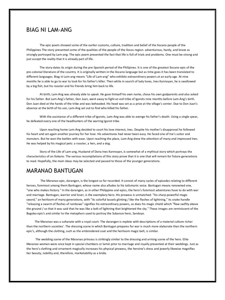 The Life of Lam-ang is an epic story of the Ilocano people from the Ilocos region of the PhilippinesIt is notable for being the first Philippine folk epic to be recorded in written form and was one of only two folk epics documented during the Philippines Spanish Colonial period along with the Bicolano epic of Handiong. Epiko ang ating bansa ang ilan sa kilalang mga halimbawa ng epiko ng pilipinas ay ang biag ni lam ang epikong ilokano ibalon epiko ng bicol maragtas epiko ng bisayas at indarapatra at sulayman epiko ng mindanao ang sanaysay o essay sa wikang ingles ay isang komposisyon na kadalasan ay naglalaman ng pananaw o kuro kuro ng may akda. Compare Search Please select at least 2 keywords Most Searched Keywords.